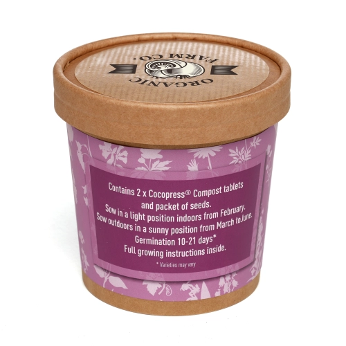 12oz natural paper cup containing two Cocopress® compost tablets, a seed packet with many varieties to choose from including English Daisy, Butterfly and Bee mixture, Cornflower, Forget me Not, Sunflower, Dwarf Sunflower, Summer Flowers, Evening Primrose, Lavender, Strawberry, Poppy, Wildflower and Xmas Tree along with planting instructions and a branded paper label to the lid.