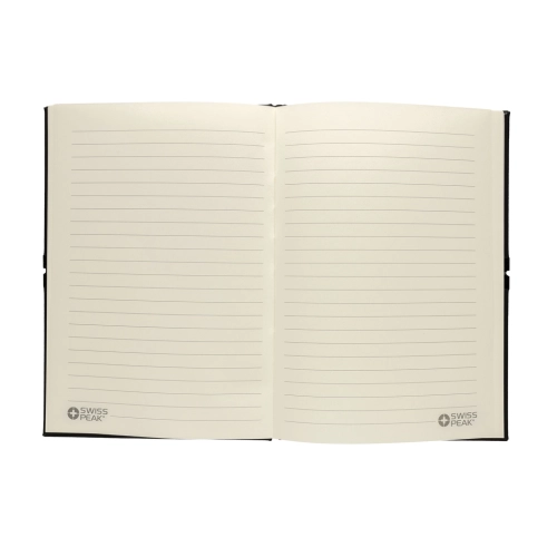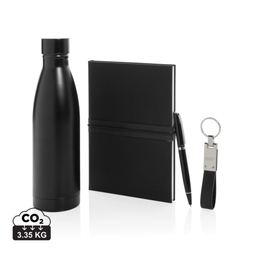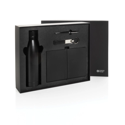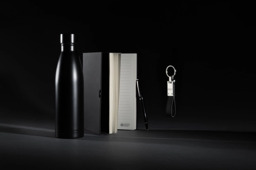 This luxury gift set includes all the essentials you need to get through your workday with comfort and style. The 480 ml double-walled water bottle is made from recycled stainless steel and features vacuum insulation to keep your drinks hot or cold for hours. Thanks to its leak-proof lid, you can carry it with confidence—no spills, no worries.To keep your most important keys always within reach, the set includes a premium Swiss Peak keychain with a glossy metallic finish and a beautifully crafted PU leather strap.Need to capture your ideas on the go? The set also includes a sleek business ballpoint pen with an 1000 metre writing capacity, paired with a soft-touch notebook made from recycled polyester PU. Inside, you'll find 160 cream-coloured pages made from recycled paper—perfect for jotting down notes, ideas, or to-do lists.All items are RCS certified, ensuring a fully verified supply chain for all recycled materials used.